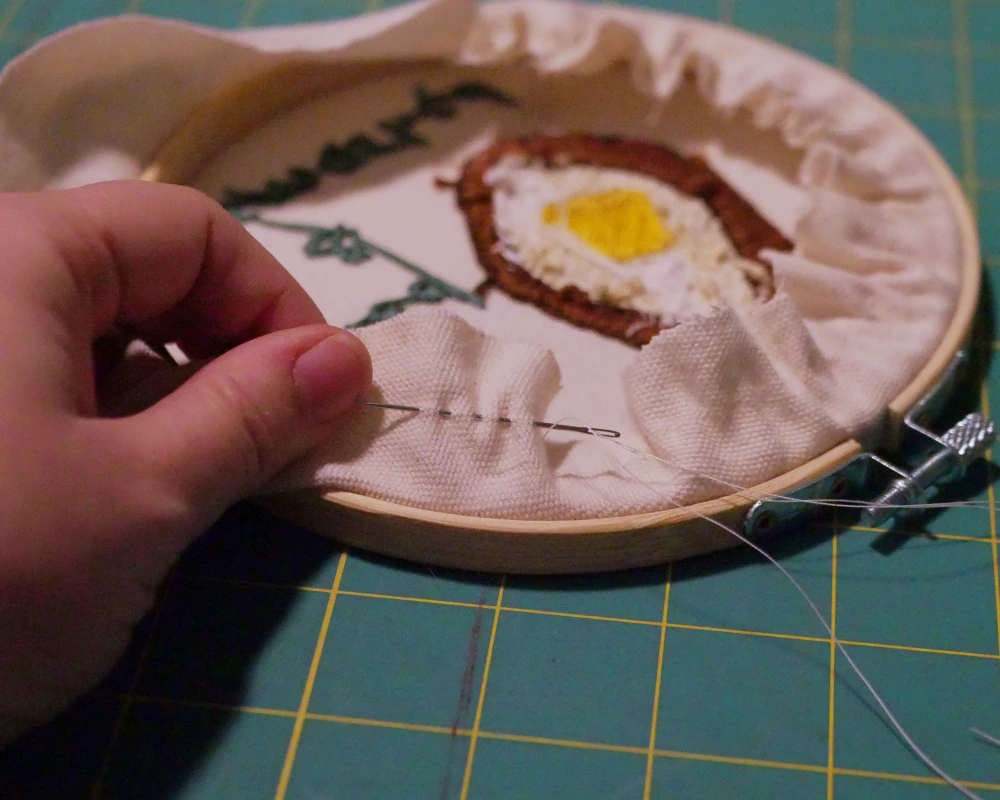 The easiest way to finish your embroidery is to put it back into the hoop and just trim away excess fabric, as close to the frame as possible. The stitches will still show on the back, but if it’s hanging on a wall, no one will see it anyway.