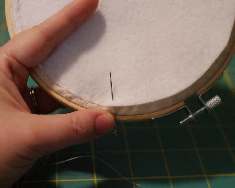 If you don’t want any stitches to show on the back of your hoop, you can cover the back with a circle of felt, the same size as the inner ring of your embroidery hoop.